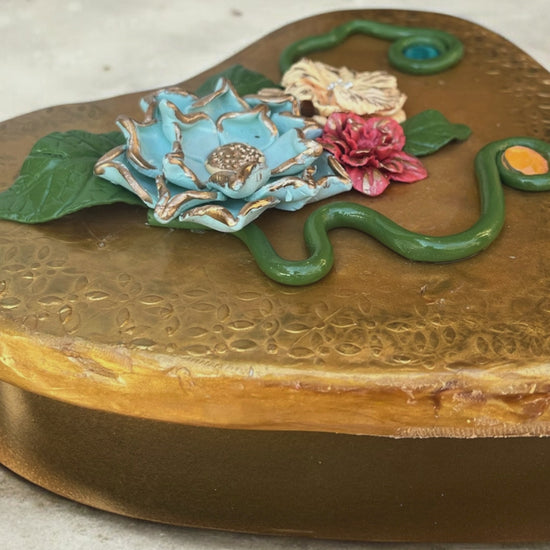 This heart-shaped tin is adorned with hand-sculpted polymer clay flowers, beautifully set against a rich gold textured background 💛