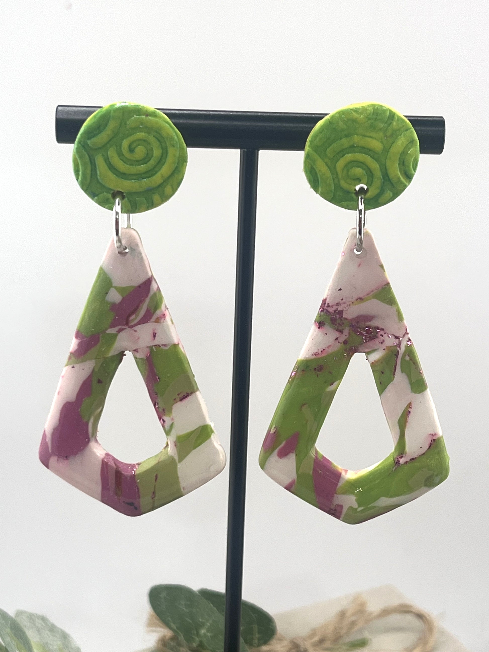 Brighten up your look with our Spring Green and Fuchsia Polymer Clay Earrings! These playful dangle studs are the perfect accessory for the season. Plus, with free shipping. Get ready to turn heads with these fun and colorful earrings!